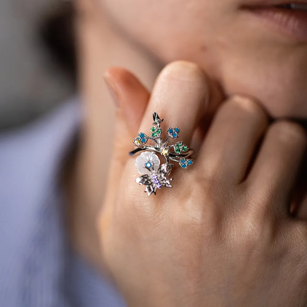 The Eos’ Dawn Garden Set is a radiant tribute to Eos, the Roman goddess of the dawn. With mother-of-pearl flowers and multicolored gemstones, this set captures the brilliance and hope of a new day. The intricate sterling silver design, adorned with floral and butterfly motifs, reflects the vitality and grace of Eos’ gardens, symbolizing renewal and transformation.