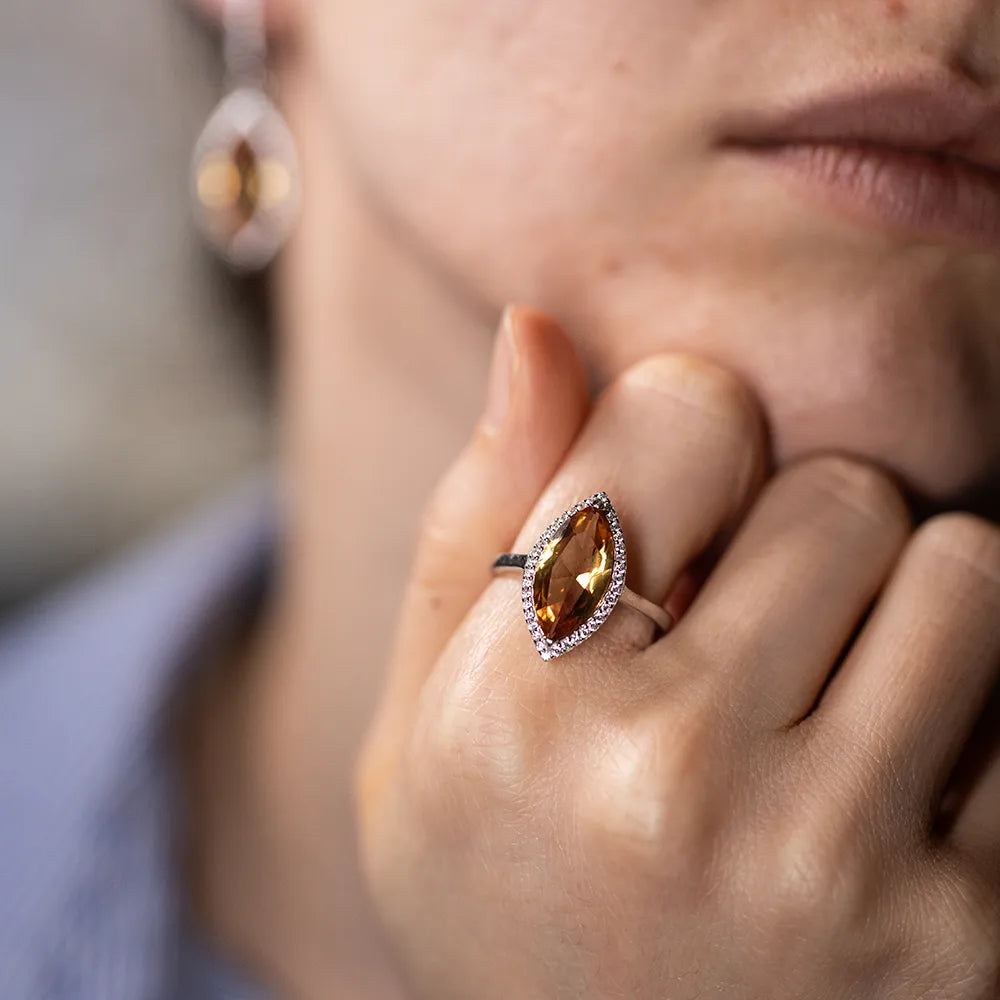 • Design: Elegant marquise-cut centerpiece surrounded by a shimmering halo of zircons, creating a timeless aesthetic.