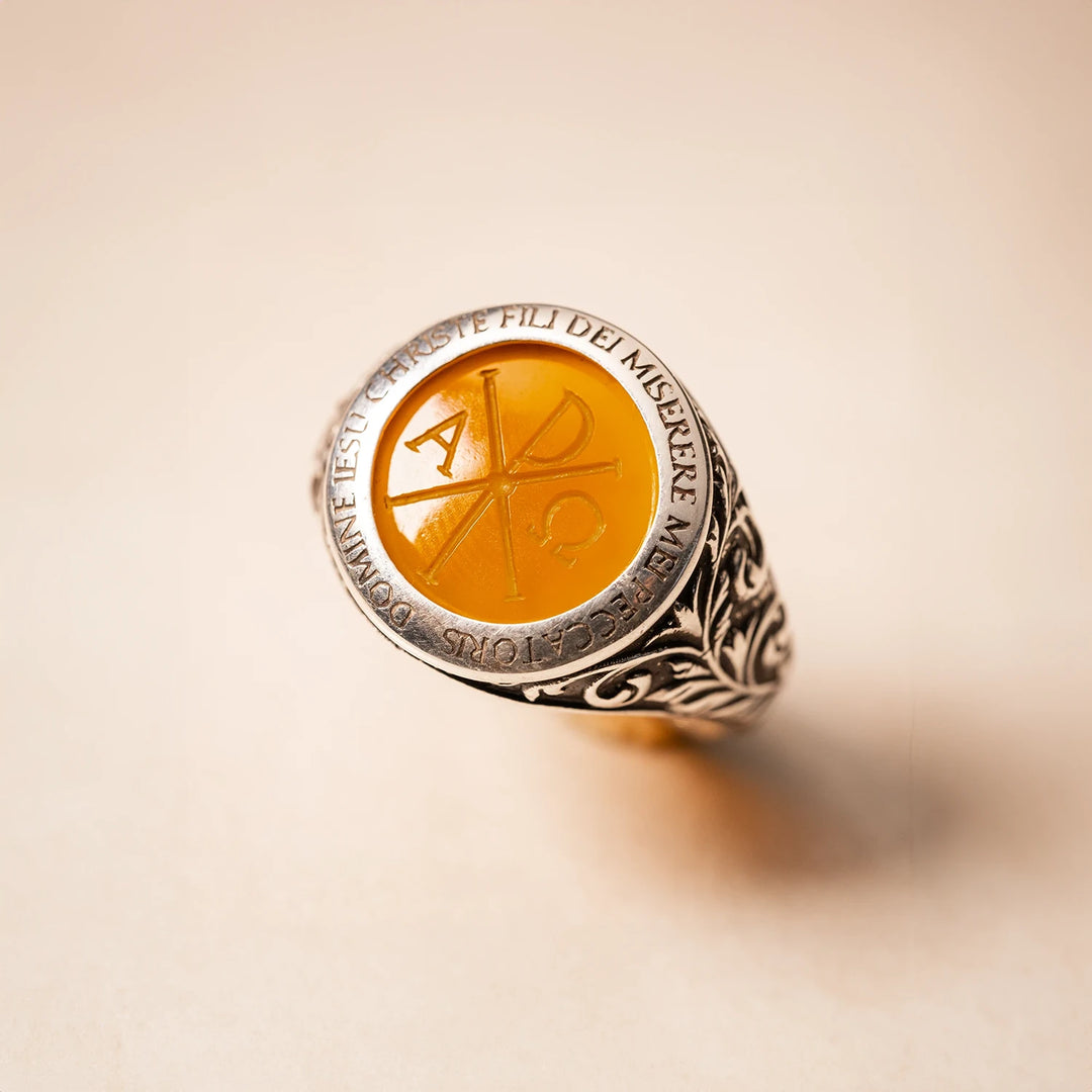 This original intaglio design is crafted entirely by hand by our master artisan. The stone is meticulously engraved by hand. This one-of-a-kind ring is made to pay homage to the original jewelry originally envisioned by the Romans around 300 AD.