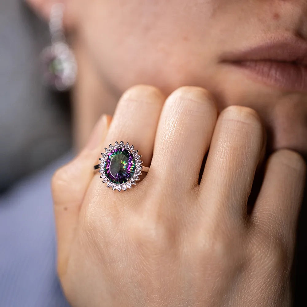 • Oval Cut with Halo Design: The oval cut showcases the prismatic play of colors, surrounded by shimmering accents that mirror the goddess’s ethereal grace.
