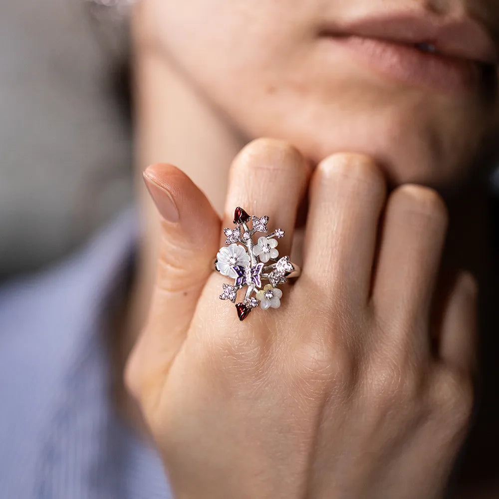 The Persephone’s Enchantment Set is a striking homage to Persephone, the goddess of spring and queen of the underworld. Delicate mother-of-pearl flowers and deep garnet accents symbolize her dual nature—life and renewal, alongside mystery and power. The sterling silver design weaves floral elegance with butterfly motifs, celebrating the beauty of transformation.
