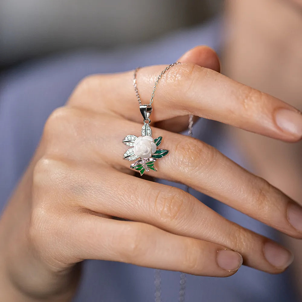 The Artemis’ Bloom Set is a tribute to Artemis, the Roman goddess of the hunt and the moon. Featuring delicately carved white mother-of-pearl roses and vibrant green enamel leaves, this set embodies the serenity and beauty of untouched nature. The sterling silver accents add a celestial shimmer, reflecting Artemis’ connection to the moonlight and her role as a protector of the natural world.