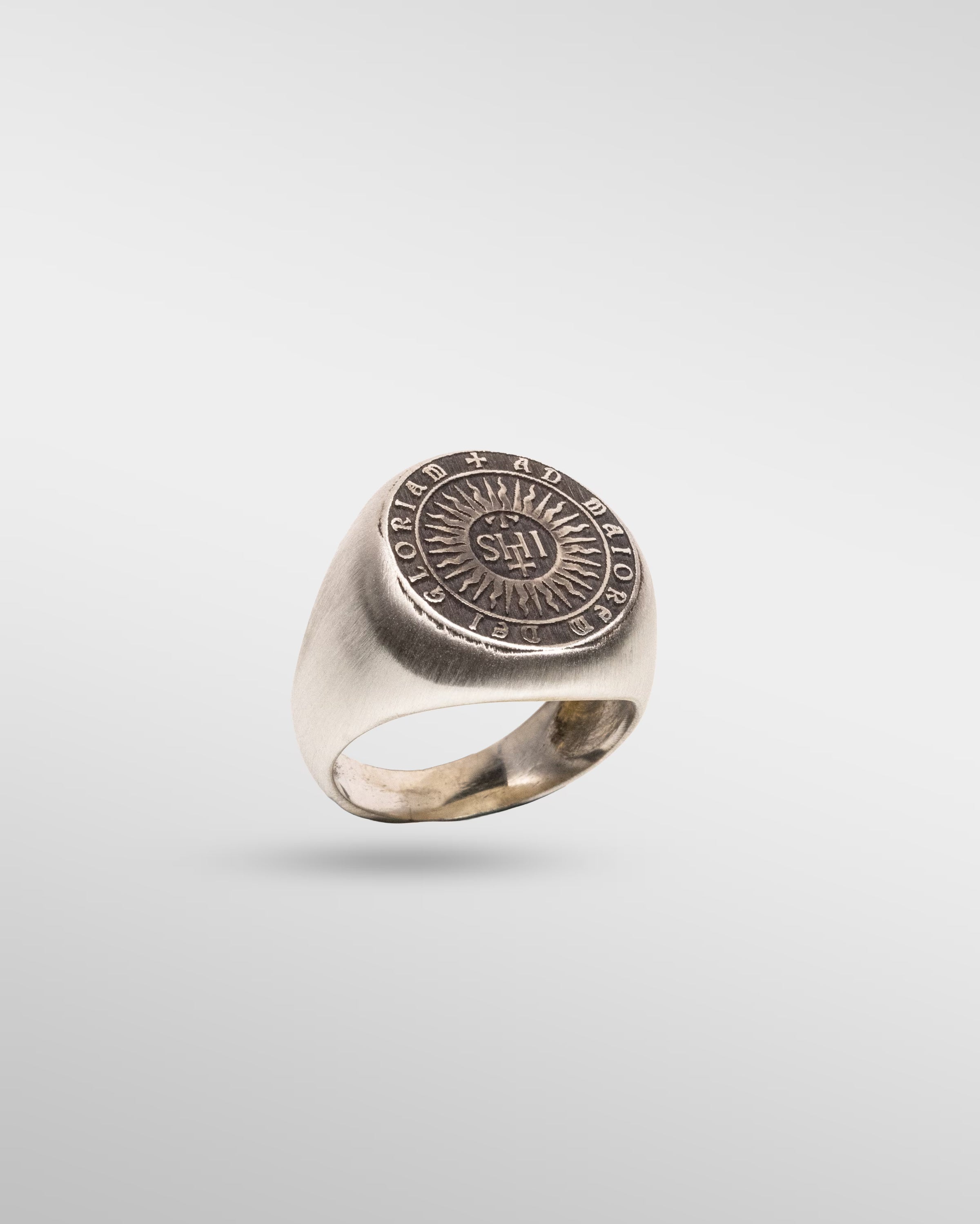 A symbol of devotion and purpose, the Glory of God Ring features the radiant IHS Christogram, representing the Holy Name of Jesus, surrounded by the Latin inscription “Ad Maiorem Dei Gloriam”“For the Greater Glory of God.”This powerful phrase, deeply rooted in Christian tradition, embodies a life lived in service of faith and righteousness. Crafted in an antique brass finish, the design echoes the timeless commitment of saints, scholars, and believers who walk in the light of Christ. A meaningful piece for those who seek to honor God’s presence in all they do.