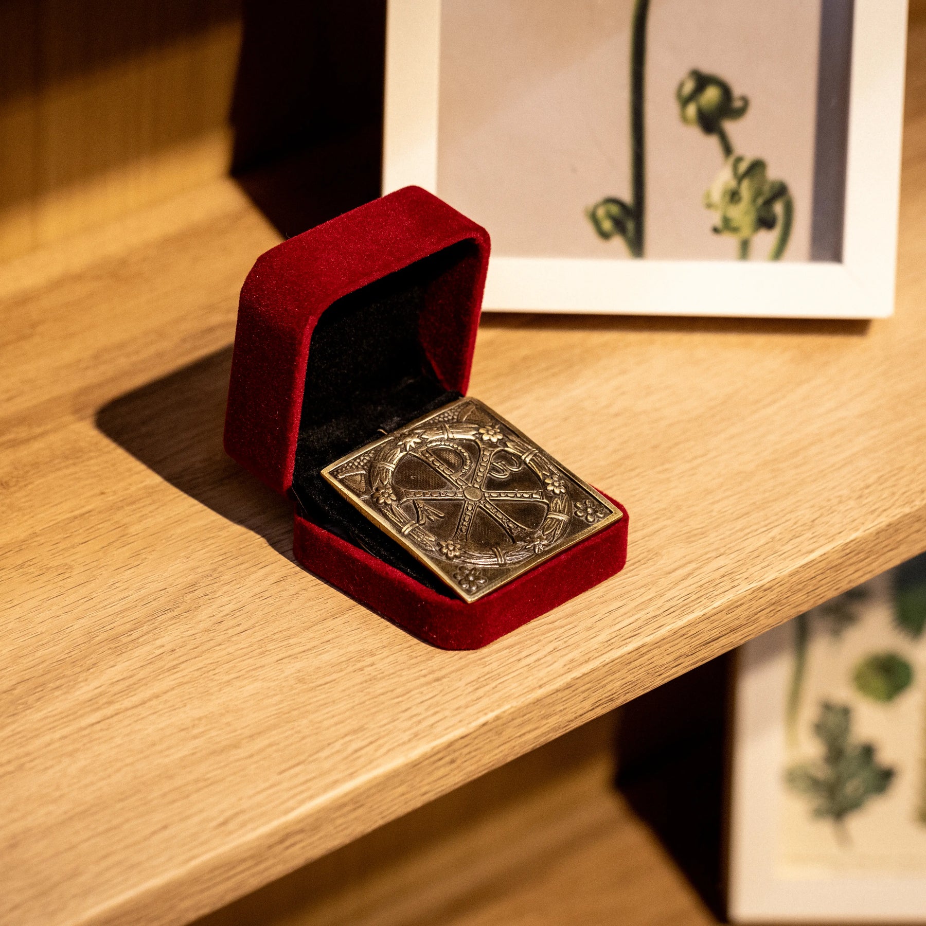 Forged in bronze, this sacred emblem bears the Chi-Rho — the ancient symbol of Christ’s triumph over darkness, first carried by Emperor Constantine’s legions as a sign of divine protection and victory.